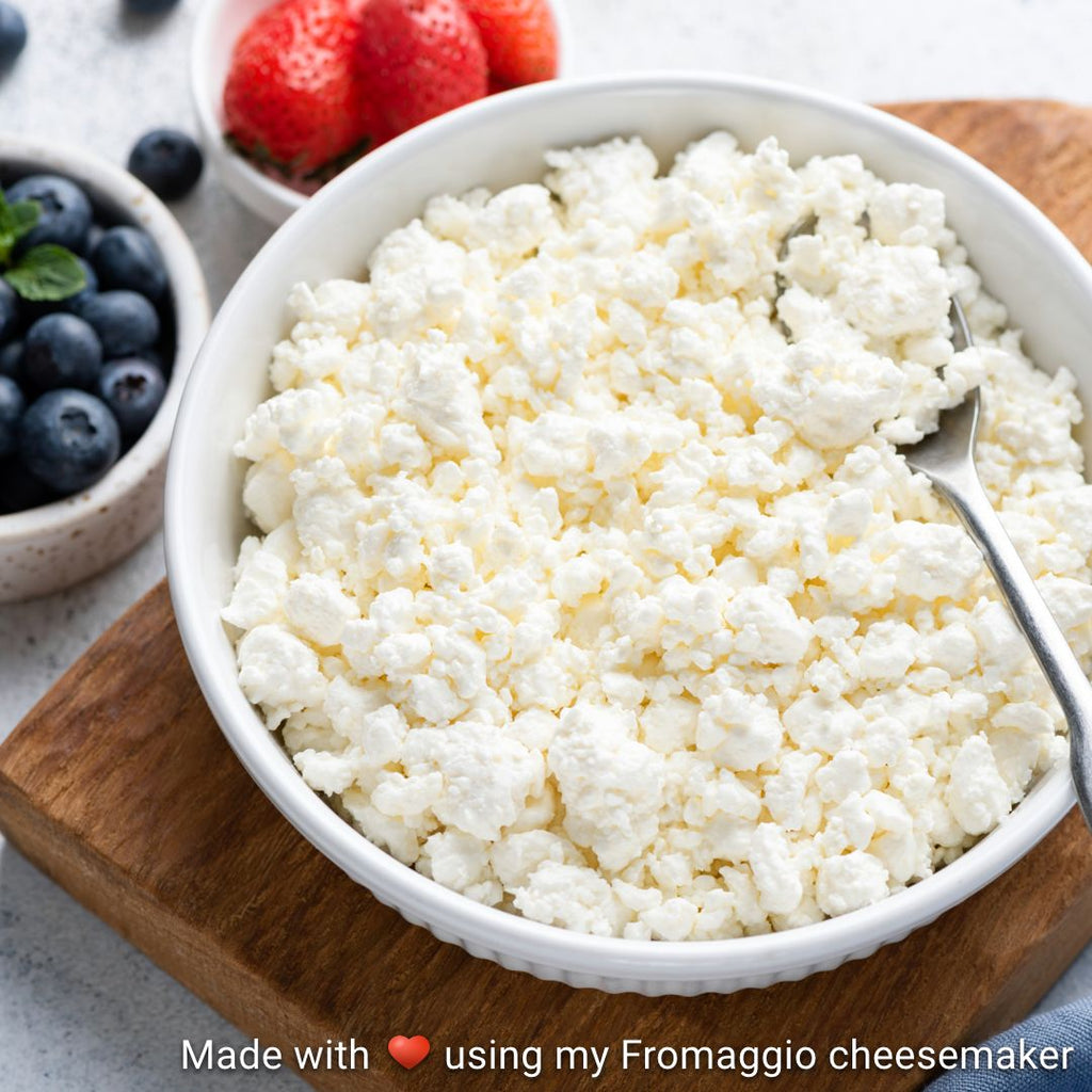 https://fromaggio.com/products/calcium-chloride||https://fromaggio.com/products/mesophilic-culture||https://fromaggio.com/products/rennet||https://fromaggio.com/products/fromaggio-salt-for-cheesemakingHüttenkäse stammt ursprünglich aus Europa und wurde von den frühen Siedlern nach Amerika gebracht. Er ist nach den „Hütten“ benannt, in denen er typischerweise hergestellt wurde. Guten Appetit!1. Anweisungen