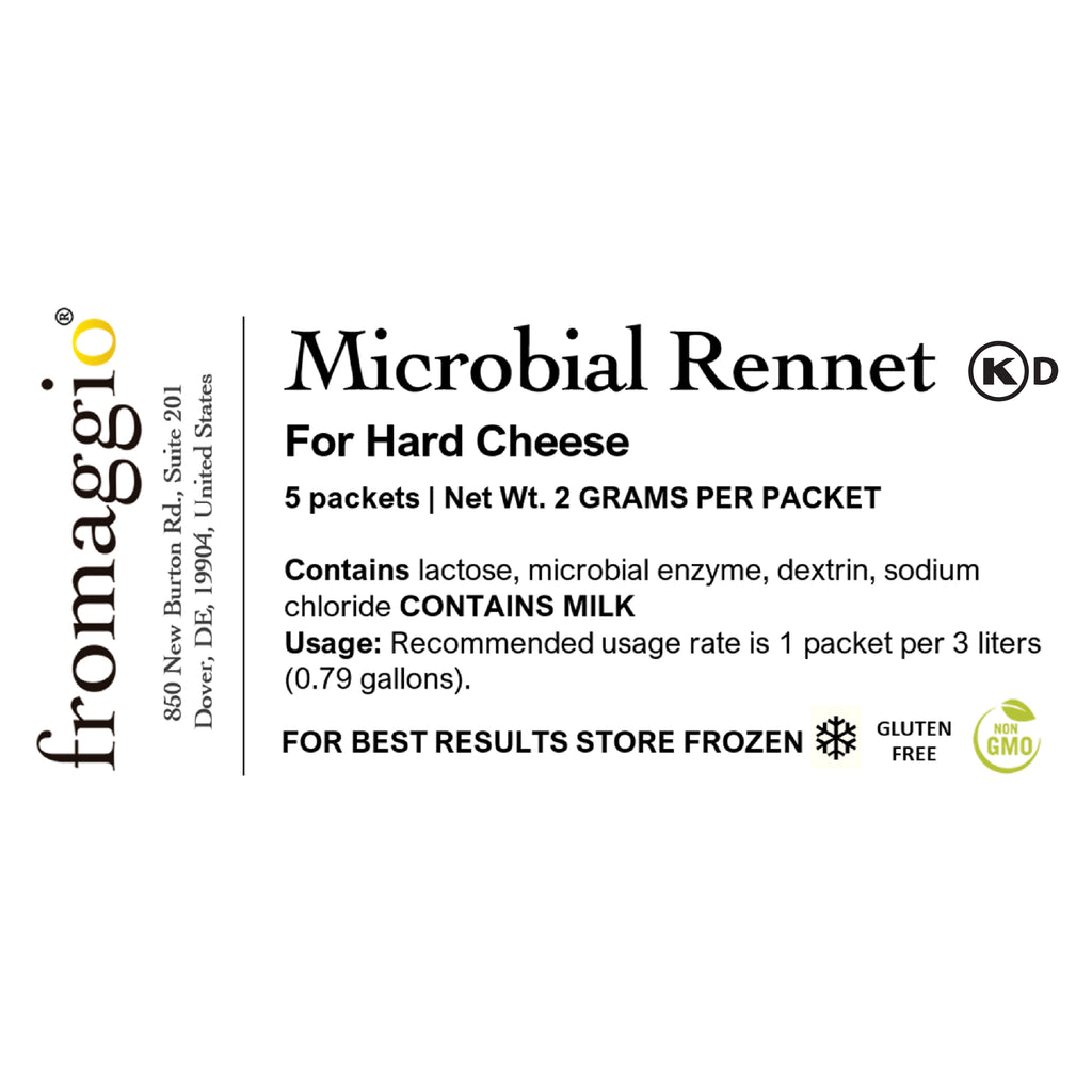 Rennet microbien, végétarien spécialement conçu pour la fabrication de fromages durs et semi-durs. Le sachet comprend 5 paquets de 2 grammes de culture de départ chacun, ce qui permettra de coaguler environ 4 gallons (15 litres) de lait.